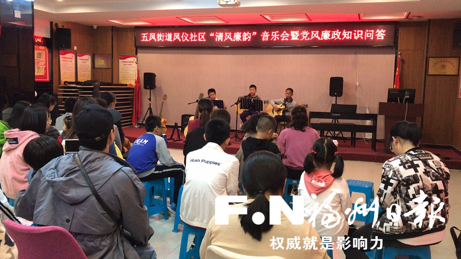 鼓樓新聞網(wǎng)11月5日訊(福州日?qǐng)?bào)記者 池遠(yuǎn) 攝)為深入推進(jìn)社區(qū)廉政文化建設(shè),營造以廉為榮、以貪為恥、崇尚廉潔、遠(yuǎn)離腐敗的社會(huì)氛圍,昨晚,五鳳街道鳳儀社區(qū)舉辦了一場以廉政宣傳為主題的“清風(fēng)廉韻”的音樂會(huì)。