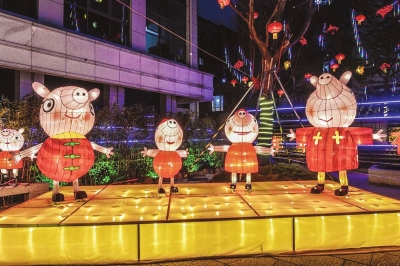 此外,今年燈會更加注重燈組內容和造型上的多樣化,兼顧各層面市民朋友的喜好。比如,既有展示鼓樓干部群眾奮發有為精神面貌的“共建首善之區、共享幸福之城”“中國夢”等主題燈組,也有展示閩都文化內涵的“十景賀春”“龍脈金湯”“福滿鼓樓”等燈組,還有孩子們喜歡的“古靈精怪”“小豬佩奇”等卡通造型燈組。同時,還注入了豬年生肖、狀元帽、金元寶、寶葫蘆等民俗喜慶等元素,使得燈組在造型和內容上豐富多彩。