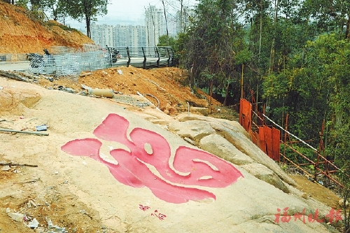 繼續(xù)往下走,即到了“福”字坪。記者看到,朱紅色的“福”字已完工,旁有落款“晦翁”。“這個福字,和烏山風景區(qū)的福字是一樣的,都來自南宋著名理學家朱熹的手跡,但比烏山風景區(qū)的大,也是福州目前最大的福字——高約4.5米。”楊臻說。“福”字坪旁的觀景臺正在施工,鋼架已建好。登高遠眺,不僅可賞福山生態(tài)公園一期大腹山步道,還可俯瞰福州城。