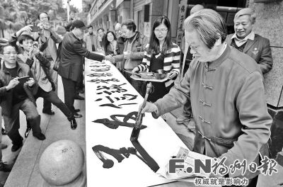 “榕城十老”是福州文化圈里名頭響當當的書法藝術沙龍,1986年,由10名書畫名家共同建立。歷經30余載,成員幾經更迭,如今還有17人,封老就是其中一員。他們平均年齡88歲,其中2名還是百歲老人。雖然歲月催人老,“榕城十老”成員的精神和態度依然與舊時一般。他們不時聚會,吟詩作對,在與社區群眾的互動中,怡然自樂。