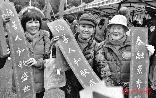 市志愿者聯合會贈送文明春聯的現場排起了長隊,“心正德生春富貴,人勤福至業輝煌”“華年朗誦文明曲,新歲高吟道德詩”……一副副寓意吉祥、倡導文明的春聯大受市民歡迎。來自洪山鎮的楊女士表示,這些春聯寓意吉祥,倡導向善、敬業,吉慶的同時又有教育意義。