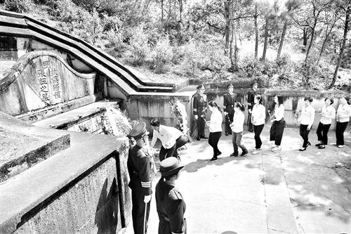 昨日上午,記者來到工貿學校后山公園的張經墓前,該校師生正在此舉行清明祭奠儀式。師生們著裝整齊,手持鮮花,列隊登上墓道,來到墓前行禮。