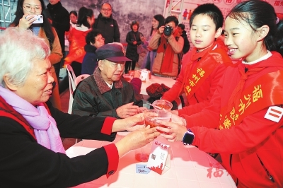 主辦方還在活動現場設置了送粥區,為老人送拗九粥。昨天雖是春寒料峭,但前來領粥的老人排起了長龍。“為了能夠讓老人盡快喝上熱騰騰的拗九粥,我們特意加派了志愿者和工作人員。”主辦方相關負責人表示,活動現場共送出1500份拗九粥,不到3小時就發放完畢。