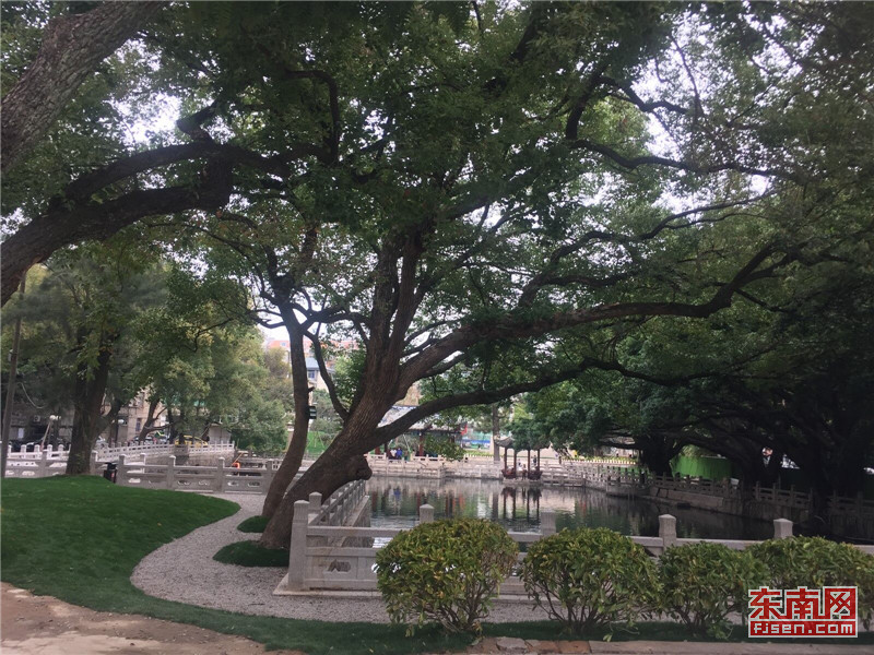 在春光照耀下,歐冶池波光粼粼,池邊古榕枝繁葉茂,倒映在水里,樹影婆娑,令人陶醉。